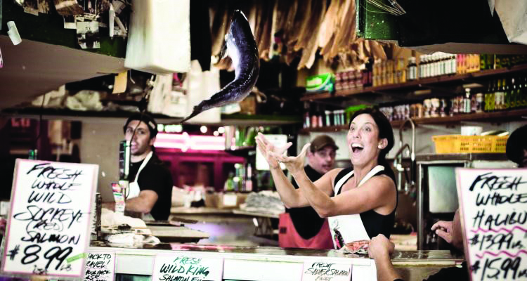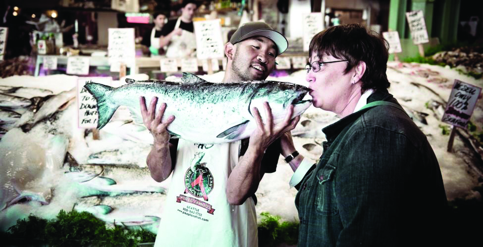 After we stopped laughing at the concept – I said, why not? I asked the group what “world famous” meant to each one of them. The initial response was signing autographs, lots of money, girls and fancy cars. Of course that response was expected from 20-something year old guys. I brought the concept back to their realty: it’s February at 6:30 a.m., cold, rainy with no one around and you have to set up the fish market – now what would it take to be “world famous?” All agreed they needed to be like marshal artists, be to work exactly on time, set up impeccable displays prior to opening at 8:00 a.m. and be totally prepared to sell fish. Then I asked them what does “world famous” look like when people walk into you area? The staff agreed people walked by the open fish market and seemed scared – the guys felt they looked predatory in the way they sold fish. “We look like fish mongers. – instead of buying fish many people walking avoid us.” One guy went on to explain that “world famous” may be when they stop seeing people as customers and more like human beings. The group wanted to start being interested in the people, let them know it’s safe at the market and more importantly that it’s o.k. if they don’t buy fish – once they defined “world famous” they were committed to it.