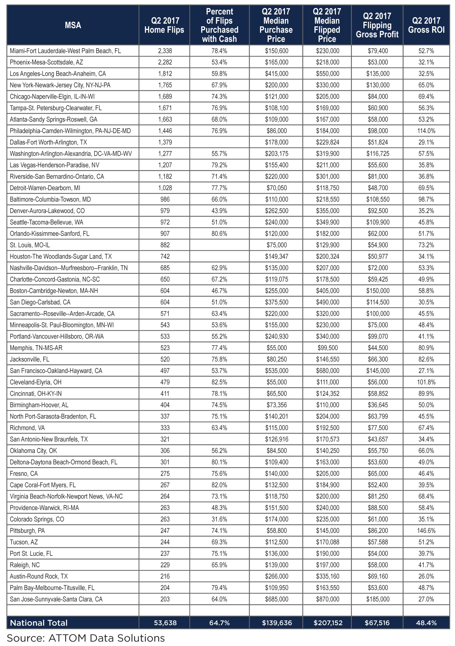 The average gross profit for house flips was $67,516, which worked out to a 48.5 percent return on investment. That might sound like a lot, but that number is a decline from a 2016 peak of 51.1 percent. Of course, these figures represent average national numbers and they can vary widely depending on the town, region or market.