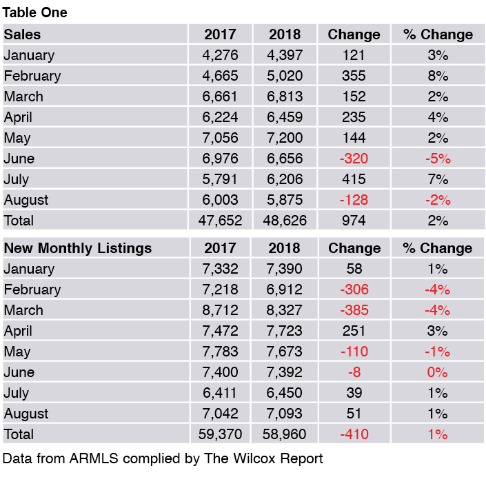 Sales of previously owned single family homes in Greater Phoenix (Maricopa County) were down two percent in August 2018 compared to August 2017, but up were up 2% overall for the first eight months of 2018 compared to 2017. New monthly listings of previously owned single family homes were up one percent in August 2018 compared to August 2017 and were down one percent overall for the first eight months of 2018 compared to the same time period last year.