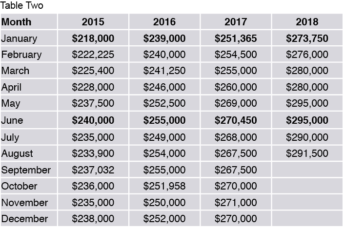 The Table below shows the median sale price for a previously owned single family homes in Greater Phoenix (Maricopa County) by month for the years 2015, 2016, 2017 and the first eight months of 2018. As seen, in each year the month with the lowest median sale price is always January. Following January, the median sale price goes up each month or stays the same, then peaks in June. Following June there is a July price drop.
