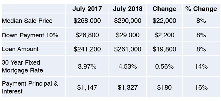 Table Four below compares what the monthly and principal interest payment would be if someone purchased a home for the median sale price, with ten percent down with the going thirty year fixed interest rate in July 2017 to 2018. The difference is a monthly payment increase of $180 dollars.