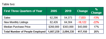 Since 2005 and 2019 are the record years for dollar sales volume, at least for the first three quarters of a year, let’s compare other numbers for these two years. Table Two compares Maricopa County sales, new monthly listings, median purchase price and the number of people employed. The median purchase price in 2005 was $260,000 compared to $302,500 in 2019, however, in 2005 there were 7,833 more sales than in 2019 or about 870 more sales a month. When it comes to new monthly listings in 2005 there were 18,122 more listings than in 2019 or about 2,013 more per month.