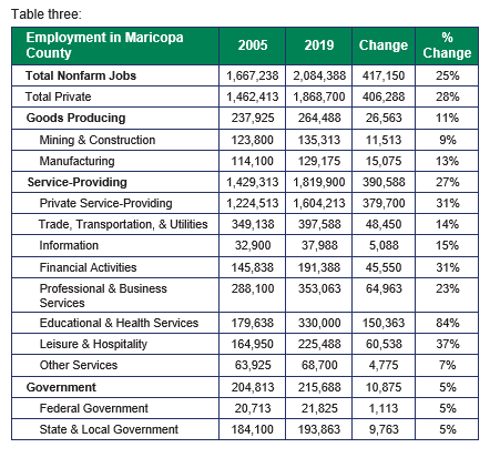 The number of people with a job has never been higher in Maricopa County. The number of people with a job is averaging 2,084,388 monthly so far in 2019. Table Three compares the number of people employed by category in 2005 to 2019. It shows the actual change in the number of jobs and the percentage change. The information was compiled from the Arizona Office of Economic Opportunity. The category with the greatest increase from 2005 to 2019 is Educational and Health Services. Employment in this category is up by 150,363 jobs or eighty-four percent. The category with the lowest increase is Government. Both Federal, State and Local Government jobs are up five percent or by 10,875 jobs.