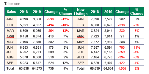 September 2019 sales were twelve percent higher than September 2018. New monthly listings in September 2019 were two percent lower than in September 2018. The median purchase price etched out a new high. It finished at $310,000 in September surpassing the previous high of $309,900 set in July 2019. September’s median price of $310,000 was $23,000 or eight percent higher than September 2018 when it was $287,000.