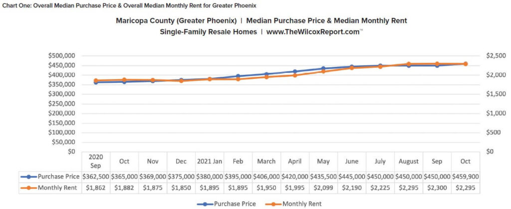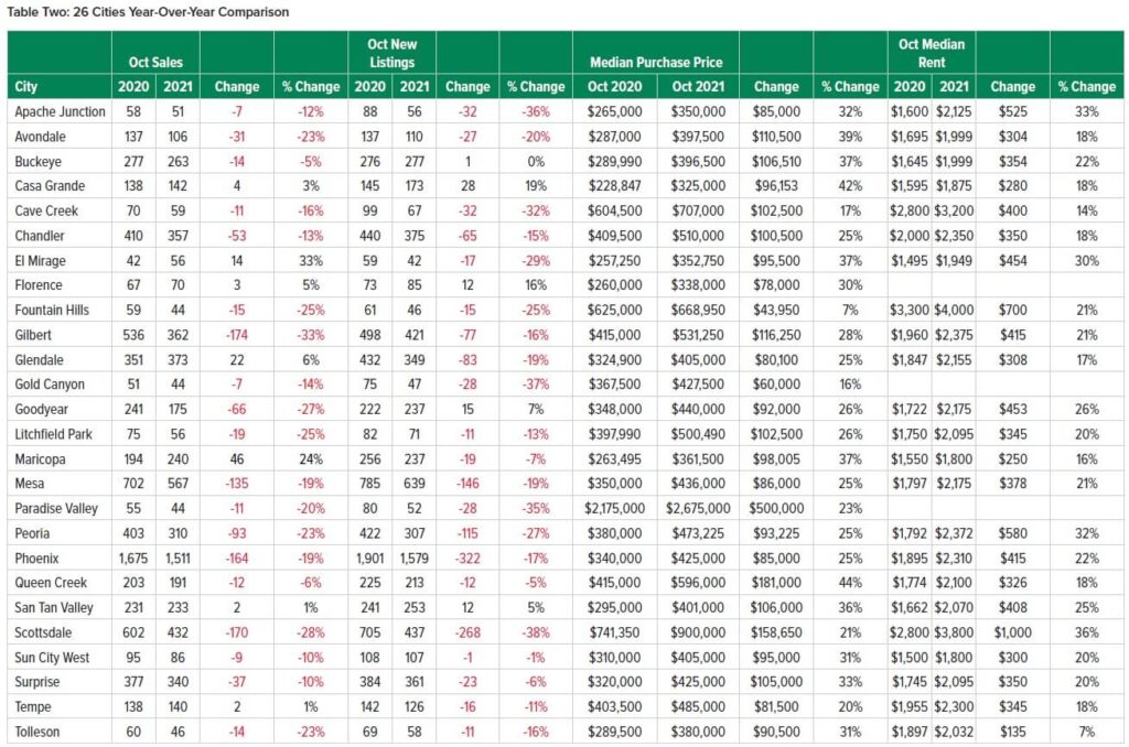 In this report we compare median purchase price, median monthly rent, sales, and listings for single-family resale homes in Greater Phoenix. The information in this report was compiled from Arizona Regional Multiple Listings Services, Inc. (ARMLS) data. ARMLS showed 7,239 sales in October 2021 in Greater Phoenix for their eight residential categories. Out of those 7,239 sales, 5,836 or 81% were in the residential category single-family detached home. The majority in this category are single-family resales. Because sales of single-family resale homes dominant the market, they are the focus of this report.