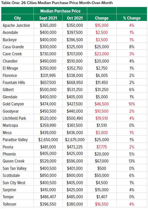 The strong demand to live in a single-family resale home continues to march on. The overall median purchase price for a single-family resale home in Greater Phoenix jumped up in October reaching a new high. This is after staying flat for three consecutive months at $450,000. October’s median purchase price was $460,000. This is $10,000 or 2.2% higher than September 2021. See Chart One. When comparing the median purchase price from September 2021 to October 2021 for 26 cities in either Maricopa or Pinal Counties, Table One shows that sixteen cities had price increases and ten cities had price decreases. When comparing year-over-year, October’s overall median purchase price is $95,000 or 26% higher than October 2020. Of course, the median purchase price is up year-over-year in all 26 cities. See Table Two. What is not up for all 26 cities year-over-year are sales and listings. Sales for this October compared to last October sales are down in nineteen cities and listings are down in twenty-two cities. It should be no surprise that both sales and listings were down in most cities this October compared to last October. Last year at the end of winter and into spring, Covid-19 kept many sellers and buyers out of the market, only to have them flood the market the remainder of the year. In October 2020, the overall number of sales for single-family resale homes was the highest ever for a month of October in Greater Phoenix. The number of listings in October 2020 was the highest in seven years for a month of October. The overall median monthly rent for a single-family resale home in Greater Phoenix in October 2021 was $2,295. This is $5 less than the $2,300 record high in September 2021. The overall estimated months of supply for single-family resale homes in Greater Phoenix is very low. For listings under $500,000 it is ten to twenty-four days depending on price point. For listings $500,000 to $799,999 about a one-month supply. From $800,000 to $1,500,000 a one to two-month supply.