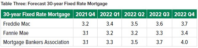 Table Three shows what Freddie Mac, Fannie Mae and the Mortgage Bankers Association forecast the 30-year fixed rate mortgage to be for all four quarters in 2022. All three organizations predict higher mortgage rates next year with mortgage rates going higher as the year goes on. Freddie Mac expects total national home sales in 2021 to be 6.8 million and in 2022 expects 6.8 million sales, while Fannie Mae projects total national home sales in 2021 to be 6.77 million and 6.54 million in 2022. The consensus is home prices will rise in 2022, but at a slower pace than 2021. There is not a consensus on whether inflation will persist or alleviate in 2022. It depends on if the cause is monetary policy or if supply chain shortages or a combination of both.