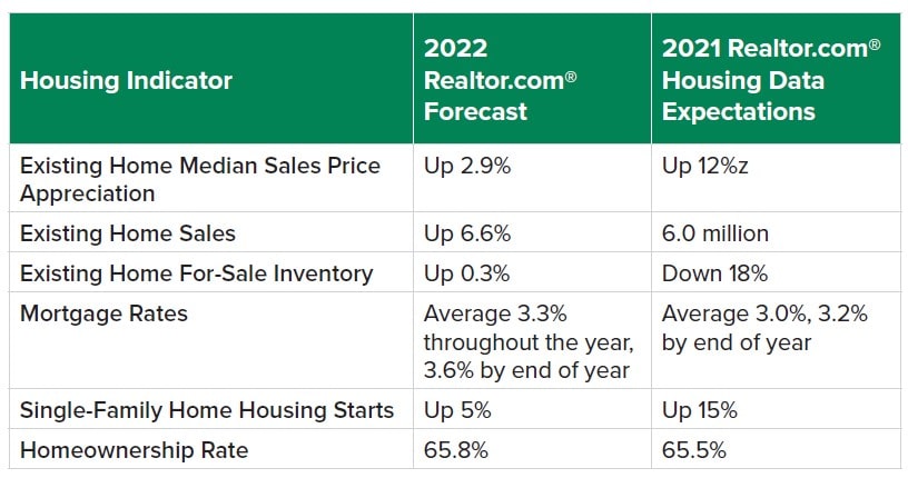 Americans will have a better chance to find a home in 2022, but will face a competitive seller’s market as first-time buyer demand outmatches the inventory recovery. Additionally, with listing prices, rents and mortgage rates all expected to climb while incomes rise, 2022 will present a mixed bag of housing affordability challenges and opportunities. Whether the pandemic delayed plans or created new opportunities to make a move, Americans are poised for a whirlwind year of home buying in 2022. With more sellers expected to enter the market as buyer competition remains fierce, we anticipate strong home sales growth. Affordability will increasingly be a challenge as interest rates and prices rise, but remote work may expand search areas and enable younger buyers to find their first homes sooner than they might have otherwise. Below you’ll find our forecast and housing market predictions on key trends that will shape the year ahead.