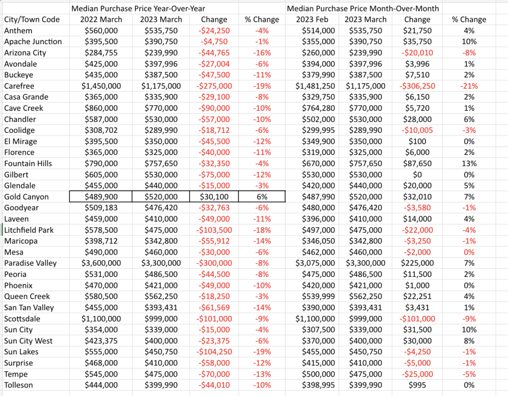 - Table One shows the median purchase price year-over-year (YOY) and month-over-month (MOM) for thirty-three cities located in either Maricopa County or Pinal County. Table Two shows that YOY the MPP is lower in 29 cities, higher in 3 cities, and 1 city had no change. MOM, 22 cities had price increases, 9 had prices decreases, and 2 cities had no change.