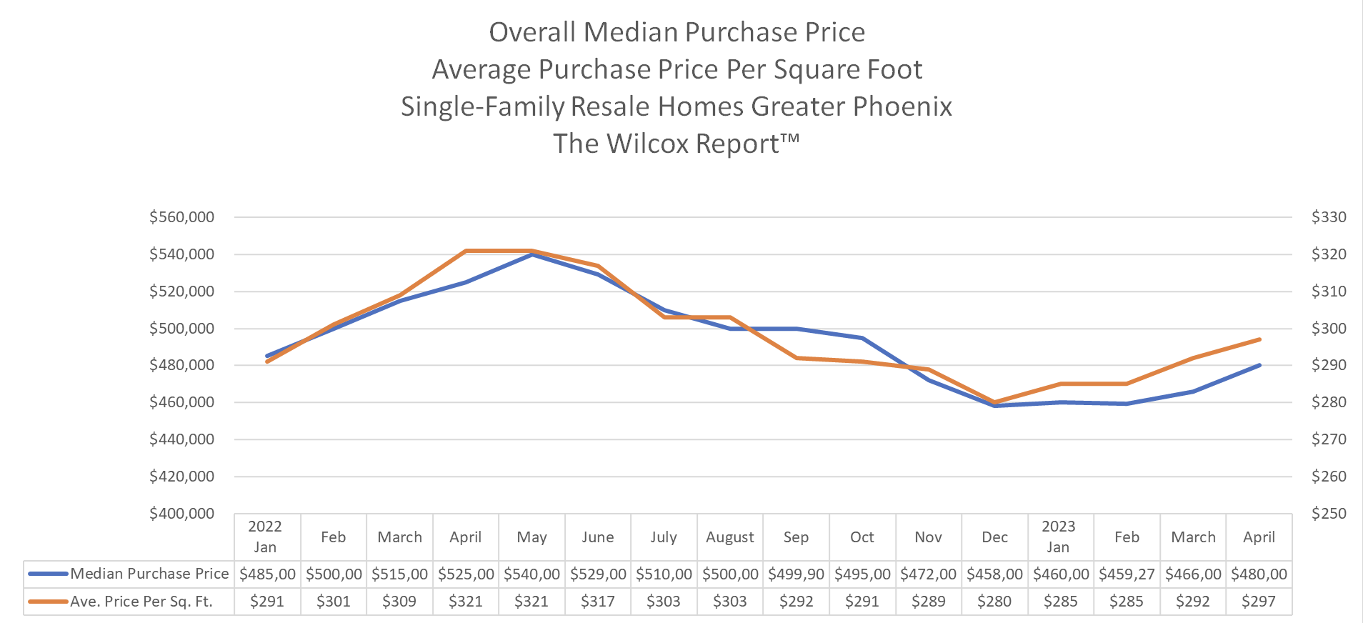 - In April 2023, the overall median purchase price (MPP) for a single-family resale home in Greater Phoenix was $480,000. This is $14,000 or 3% higher than the March 2023 MPP of $466,000. April 2023 MPP was $45,000 or 8.6% lower than April 2022 ($525,000).