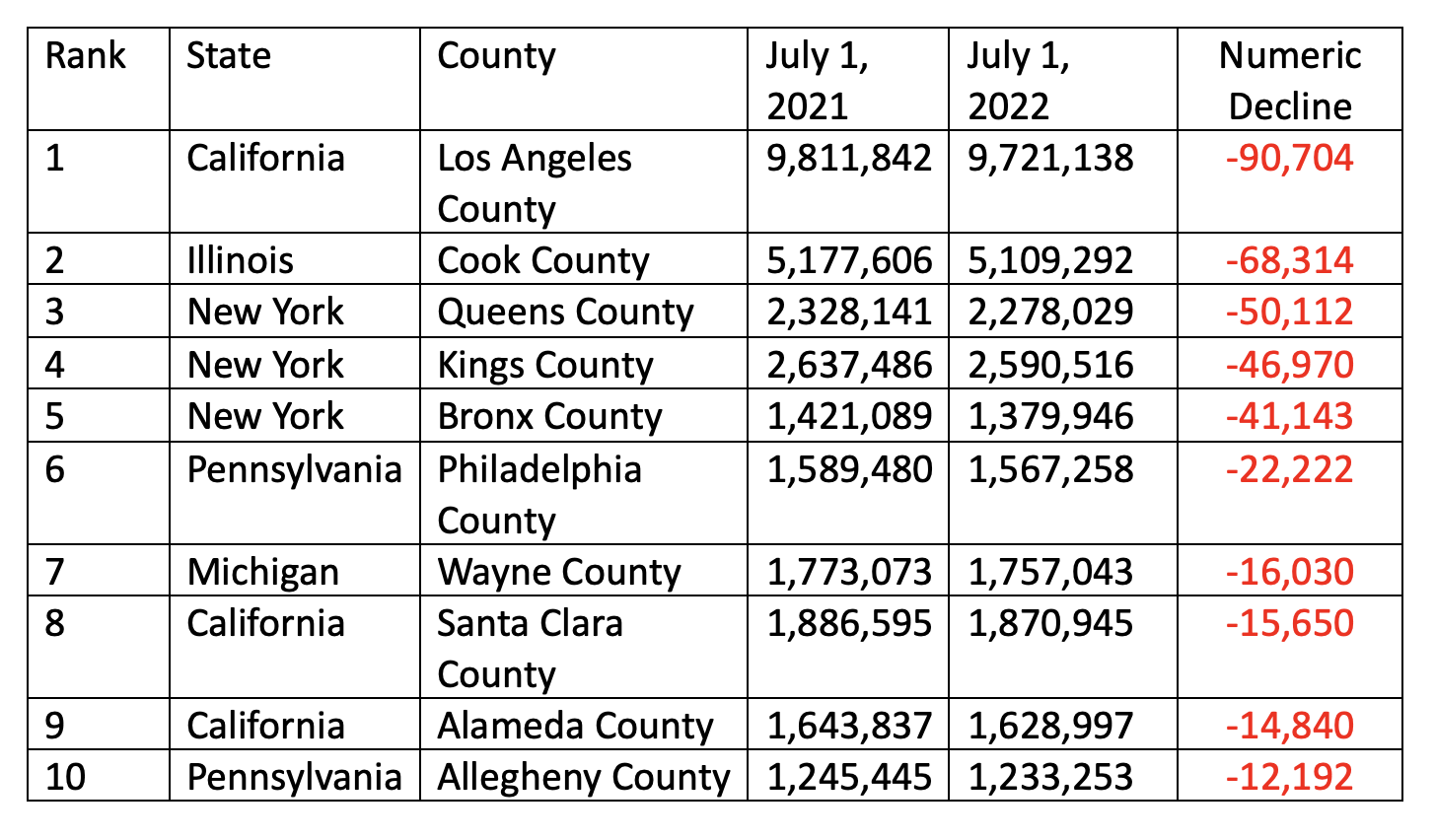 Los Angeles County led all U.S. counties in year-over-year population decline. According to the U.S. Census Bureau, Los Angeles County from July 1, 2021 to July 1, 2022 had a net loss of 90,704 people or 249 people per day. Both California and New York had three cities in the top ten. Pennsylvania had two cities and Illinois and Michigan each had one city in the top ten. See Table Two.