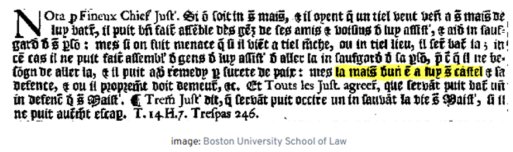 And, the home–castle phrase goes back to at least 1505. Look at this writing, from a ruling made by the King’s bench. You may not be able to read Ye Olde English, but I bet you can piece out the highlighted words.