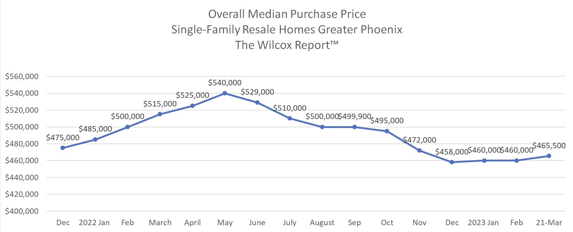 - Overall purchase price increases. The March, overall median purchase price for a single-family resale home in Greater Phoenix increased $5,500 or 1% over February. Year-over-Year (YoY) it is down $50,000 or 10%. See Chart One.