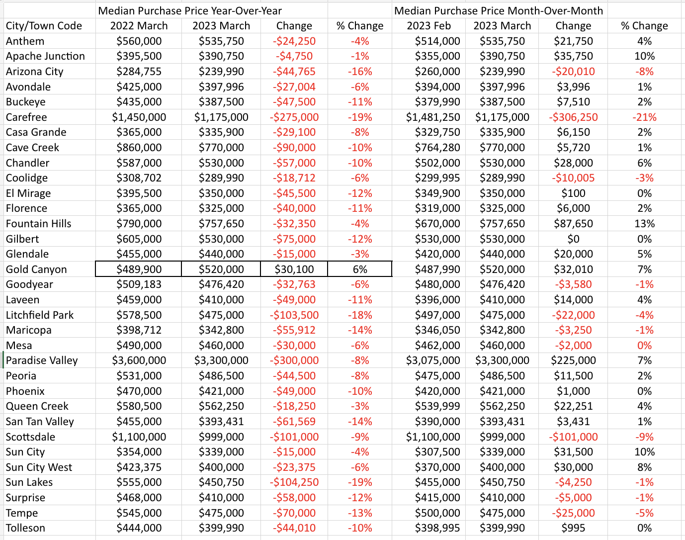 - Table Two shows the median purchase price Year-over-Year and Month-over-Month (MoM) for thirty-three cities located in either Maricopa or Pinal Counties. YoY only Gold Canyon had a higher median purchase price. MoM 15 cities had a higher median purchase price, 6 cities had a decrease, and 12 cities were with 1% of the previous month’s median purchase price.