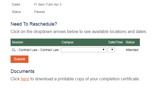 Once you’ve completed a course, a “Documents” section will appear at the bottom of the Class Information page. Click the link to download and print your completion certificate.